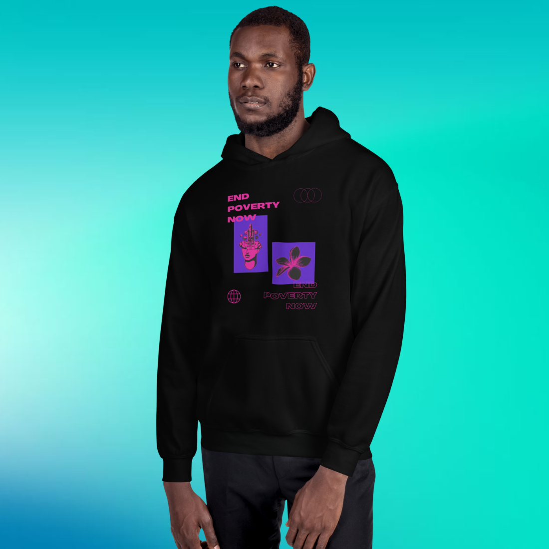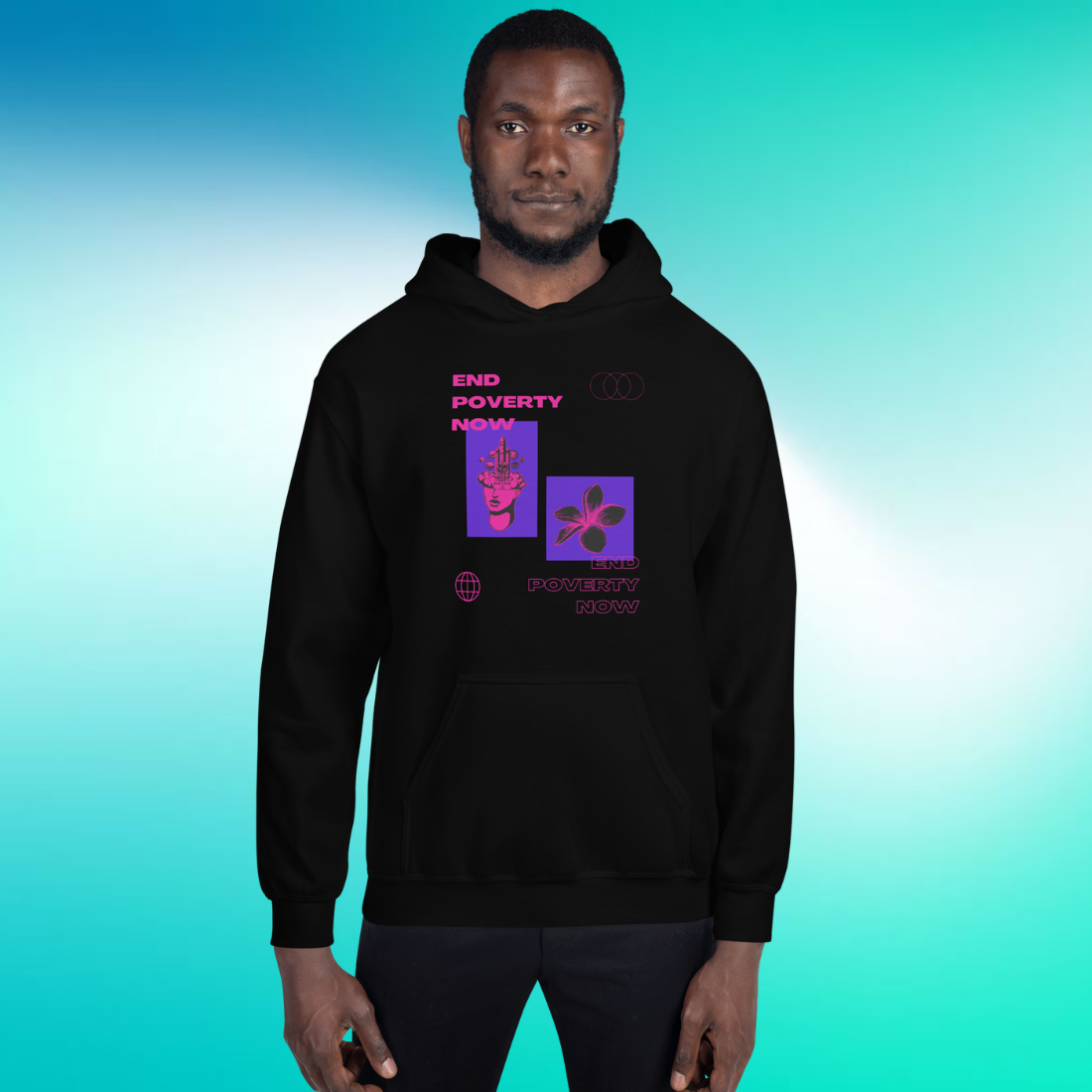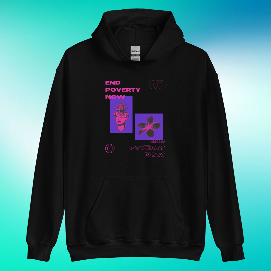 Step into our unisex "End Poverty Now" V3 hoodie and let your style speak volumes. With a bold splash of purple and pink, it's impossible to ignore the mission that you wear.