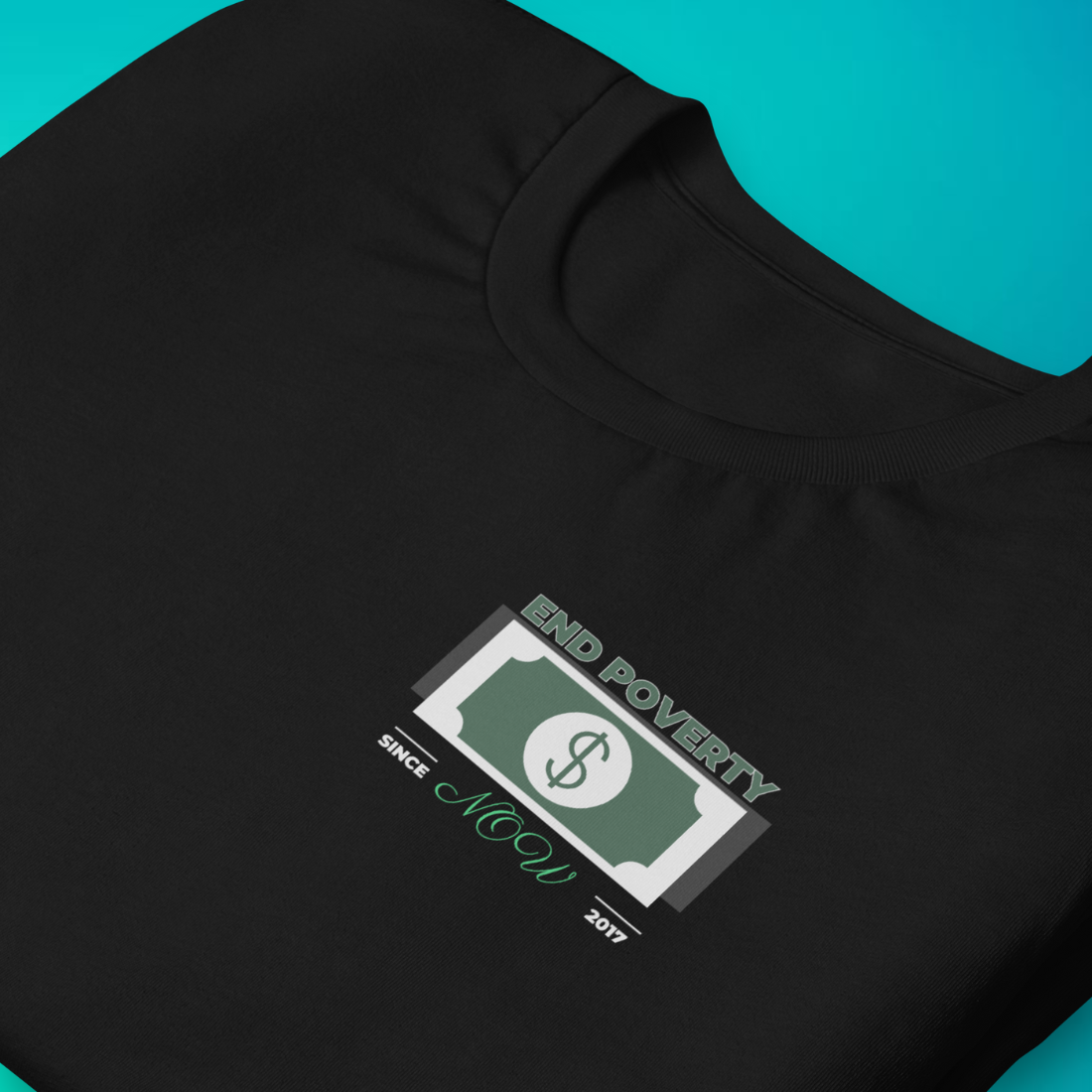 The design is simple yet impactful, turning a staple wardrobe item into a conversation starter. Wearing this T-shirt not only makes a statement but also aligns you with a critical global mission to eradicate poverty.