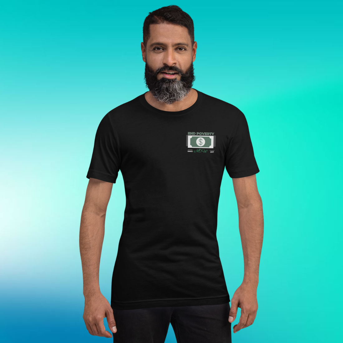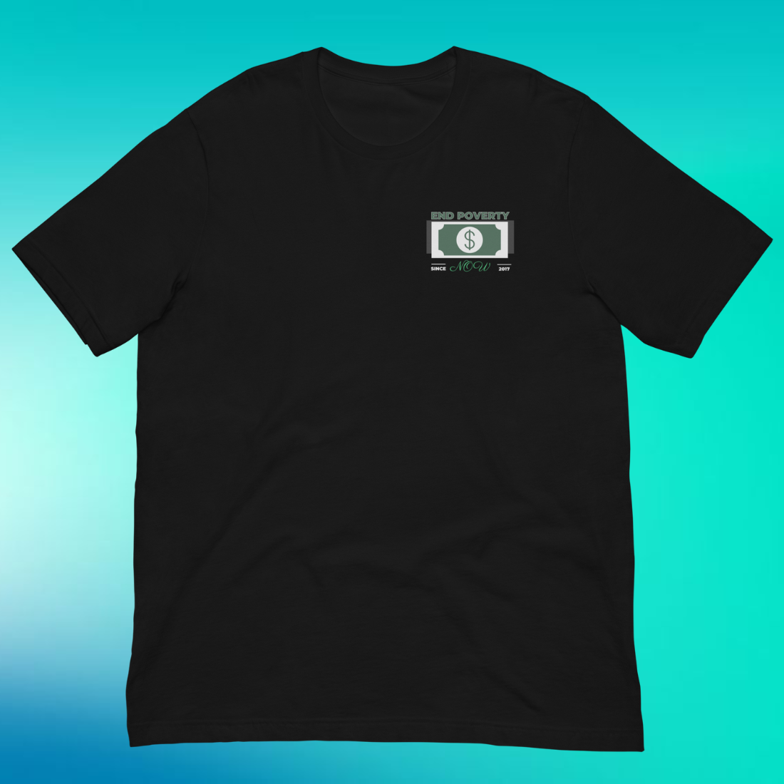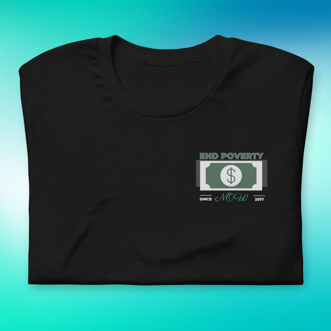 Take a stand against poverty with the "End Poverty Now" V2 T-Shirt. This tee combines a cool, contemporary design with a powerful message. Positioned on the left chest pocket area, you'll find the phrase "End Poverty Now" accompanied by a modern graphic of a green money bill with a clear "$" sign in the center.