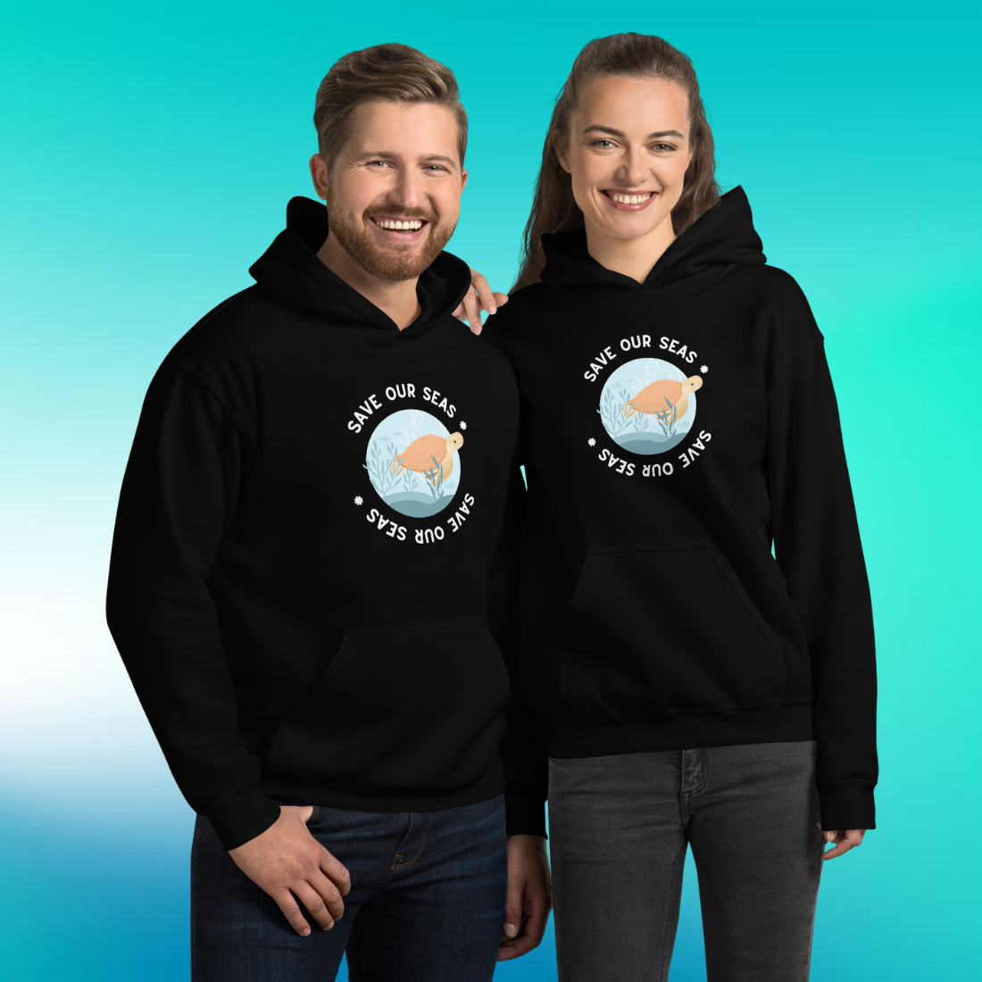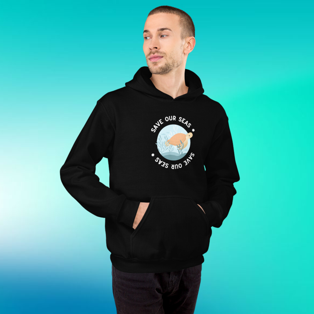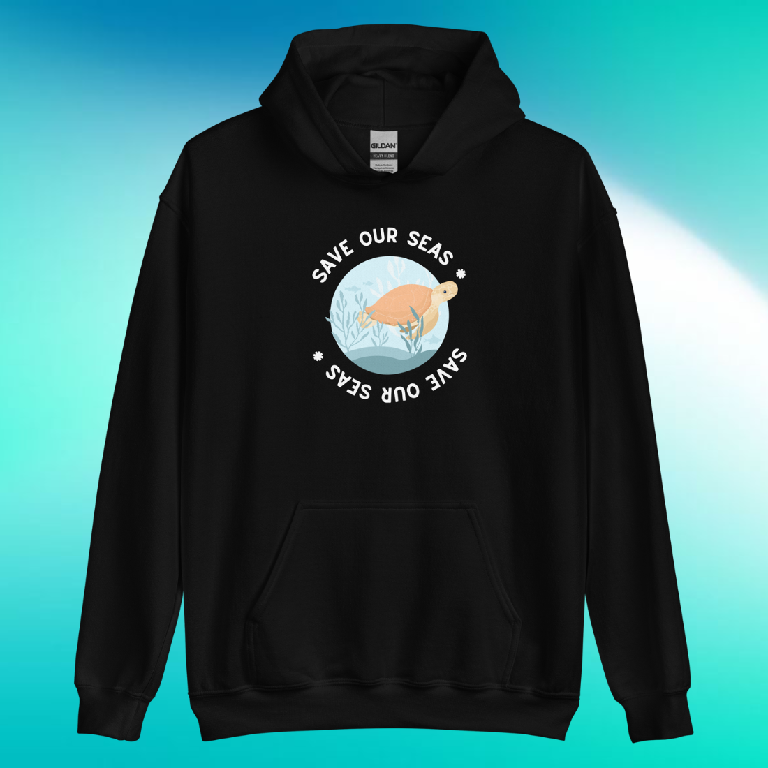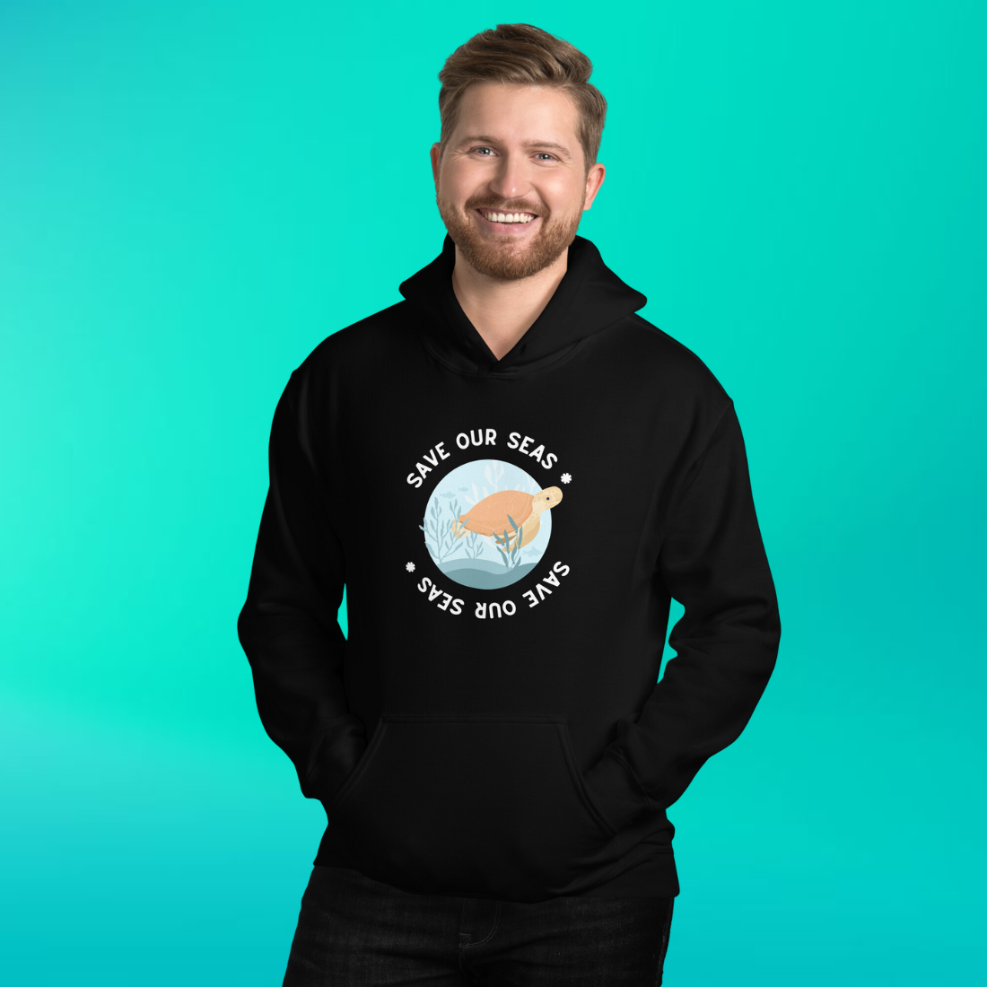 Enveloping the sea turtle are the words "Save Our Seas" repeated twice, forming a circle. The bottom phrase is intriguingly presented upside down, adding an element of the unexpected to the design. It's a visual reminder of the circular, interconnected nature of our ecosystems - what happens in our seas affects us all.