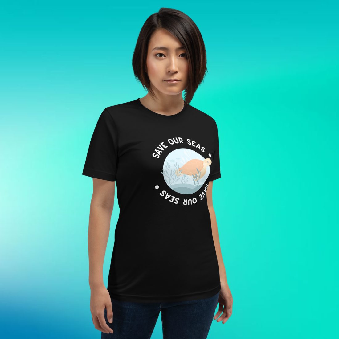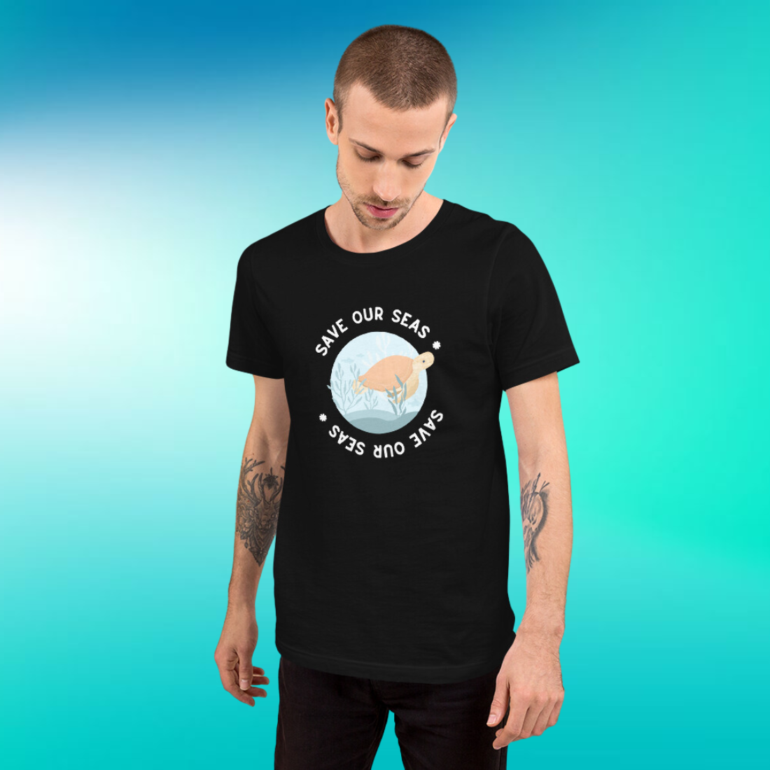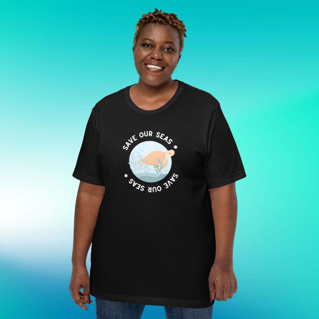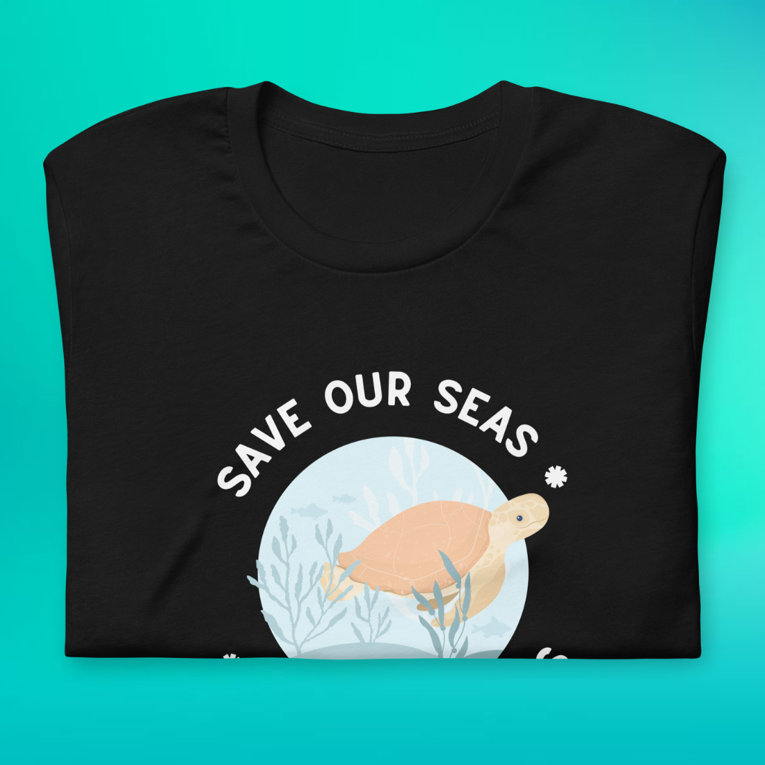 Surrounding the sea turtle is the phrase "Save Our Seas," repeated twice to form a circle. The bottom phrase intriguingly appears upside down, adding a unique twist to the design. It serves as a visual cue of the cyclical, interconnected nature of our ecosystems—what happens beneath the waves impacts us all.