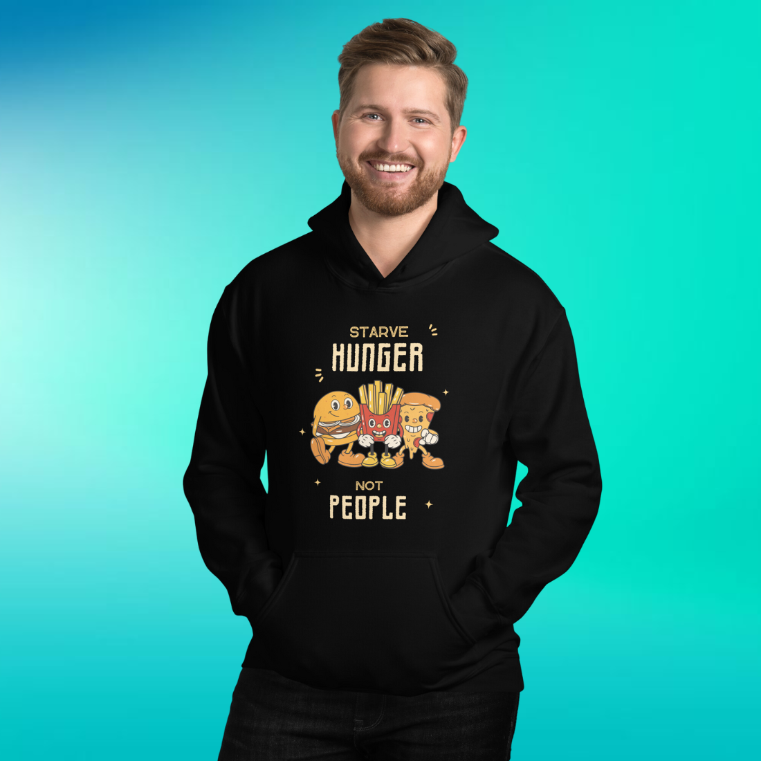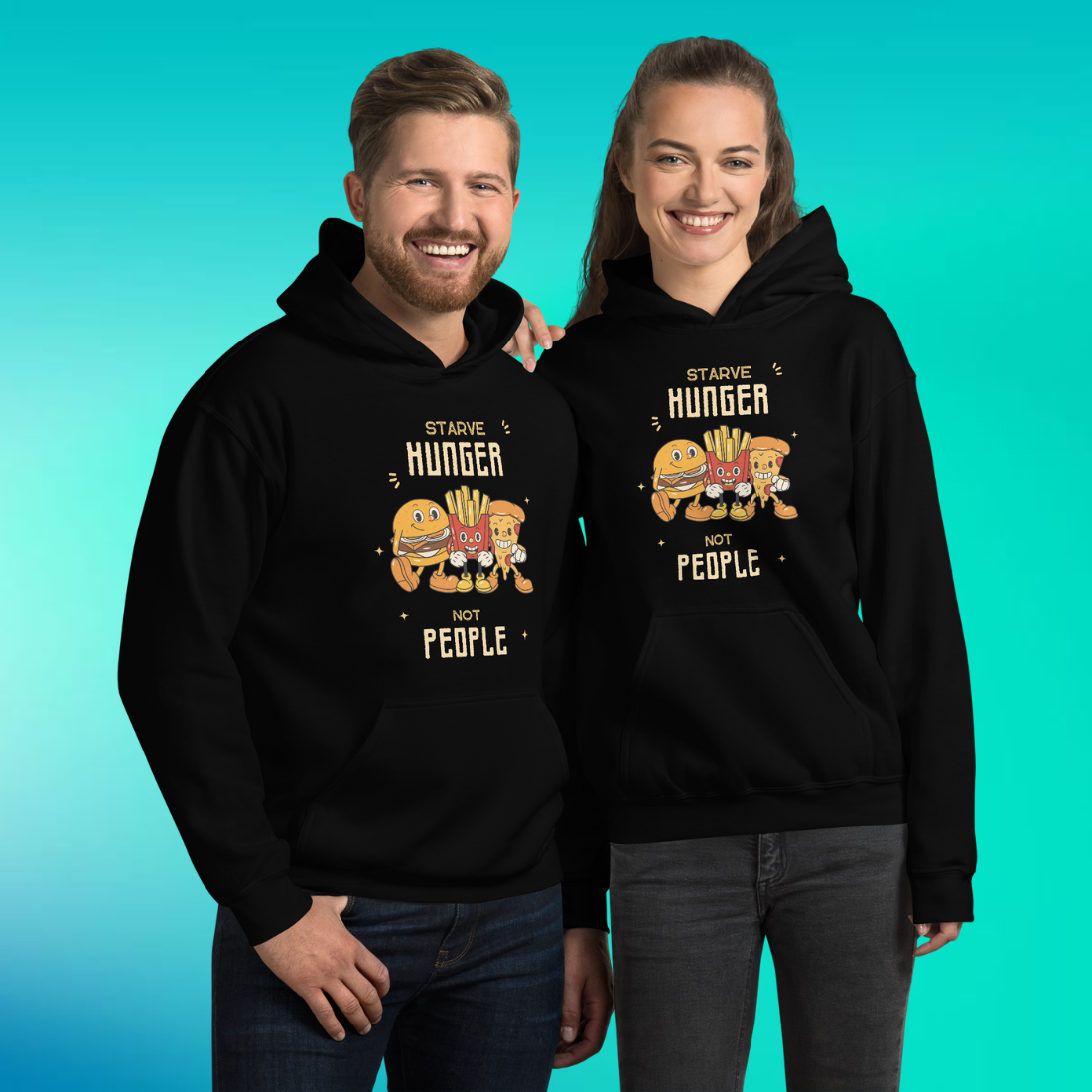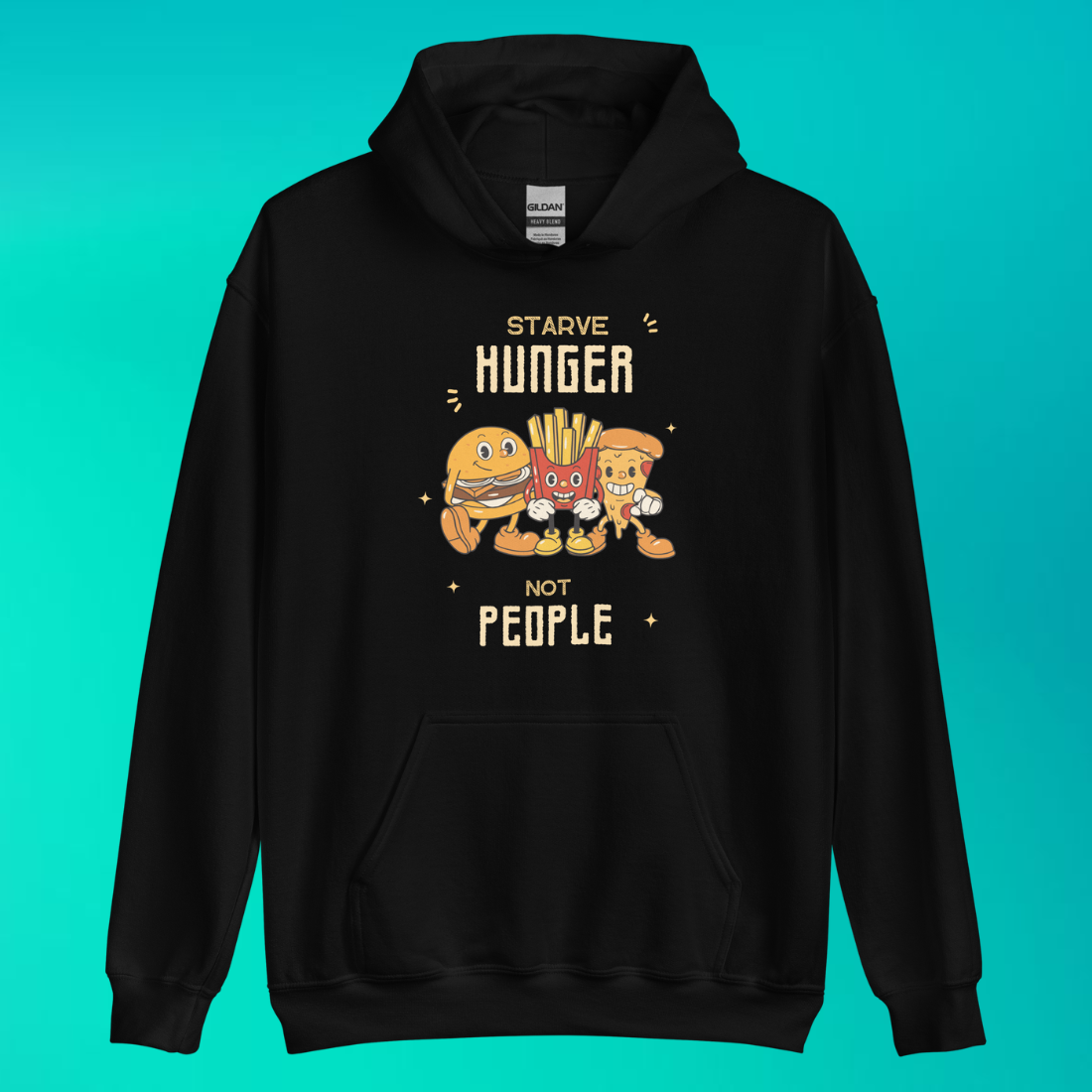 Ever thought your food could take a stand against hunger? With our V3 "Starve Hunger, Not People" hoodie, that's exactly what's happening! This bold and fun design features our favorite foods - a hamburger, french fries, and pizza, all animated with eyes, legs, and smiles! It's playful, it's striking, and above all, it sends out a powerful message: STARVE HUNGER, NOT PEOPLE.