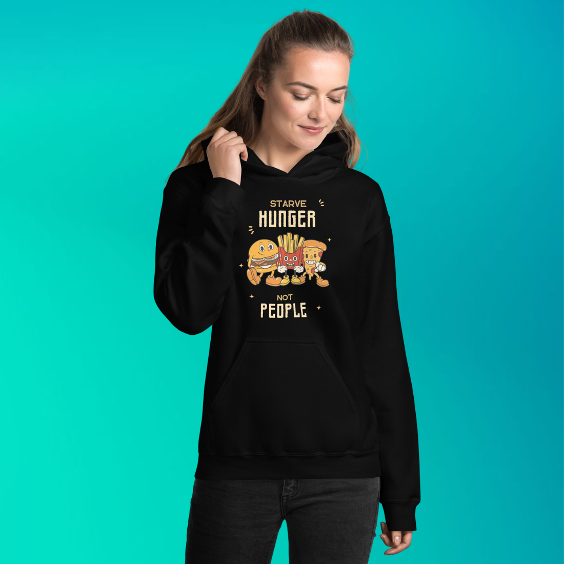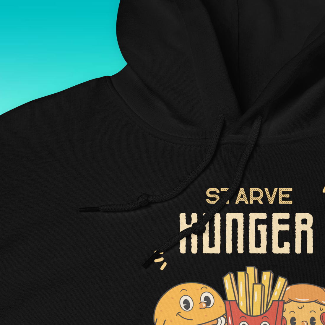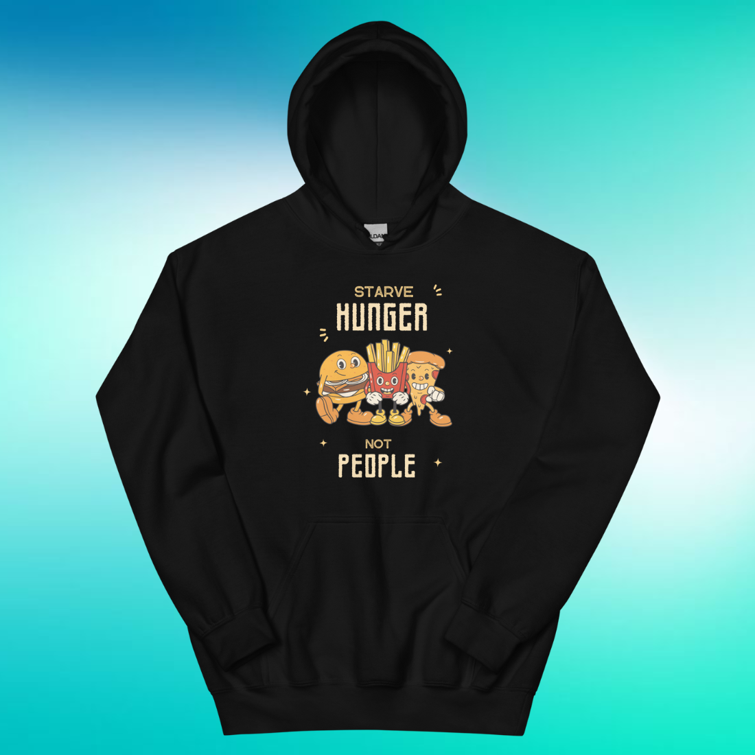 Ever thought your food could take a stand against hunger? With our V3 "Starve Hunger, Not People" hoodie, that's exactly what's happening! This bold and fun design features our favorite foods - a hamburger, french fries, and pizza, all animated with eyes, legs, and smiles! It's playful, it's striking, and above all, it sends out a powerful message: STARVE HUNGER, NOT PEOPLE.